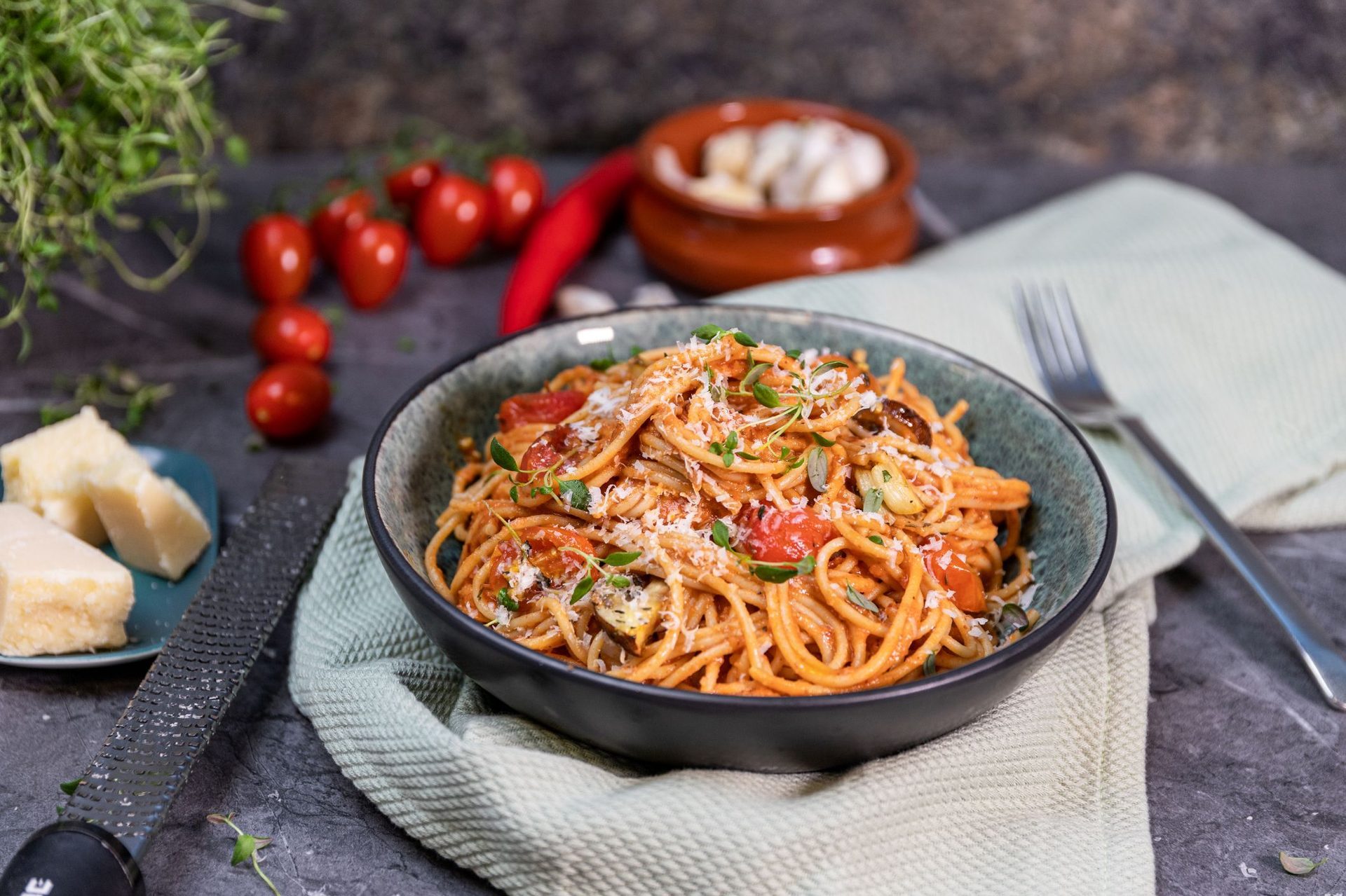 Spagetti med bakte rotgrønnsaker