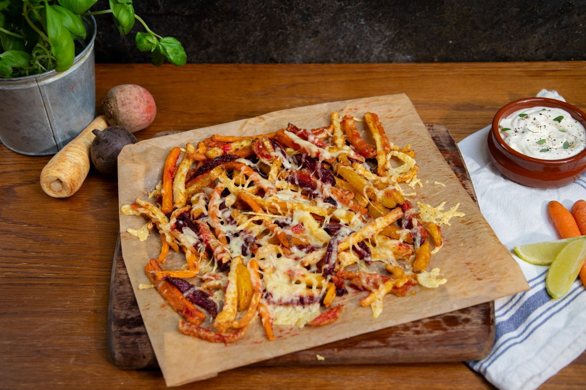 Loaded fries med rotgrønnsaker